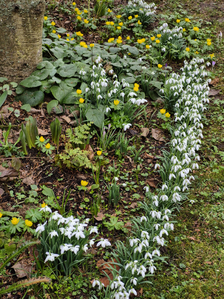 Normalerweise werden die Frühlingsblumenzwiebeln im Herbst gepflanzt. Für manche ist jedoch ein Umpflanzen während und direkt nach der Blüte die bessere Wahl. Dazu gehören vor allem Schneeglöckchen und Winterling. Lassen Sie sich von jemandem mit vielen davon einen Tuff schenken, und pflanzen Sie jede Zwiebel/Knolle davon einzeln ein. Schon im übernächsten Jahr hat sich ein Horst mit vielen Blüten gebildet. Zudem säen sich beide Arten aus. Bei den Schneeglöckchen helfen Ameisen, die ganz scharf auf das süße Anhängsel (Elaisom) am Samen sind. Nicht alle landen im Ameisenbau. Was unterwegs runterfällt, sorgt für eine neue Schneeglöckchenansiedlung. Manchmal auch auf Kiesflächen. Unterm Kies ist es im Sommer trocken, aber auch kühl, was Ameisen und Zwiebelblumen gleichermaßen mögen.