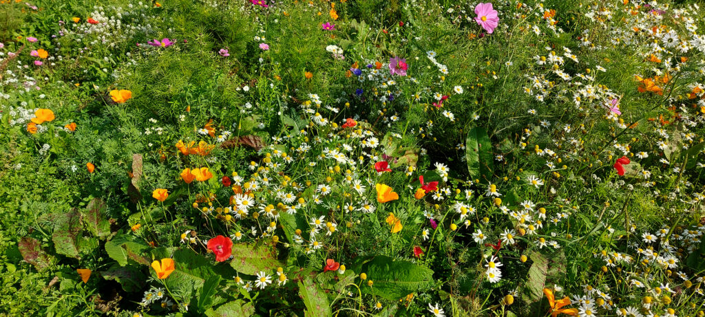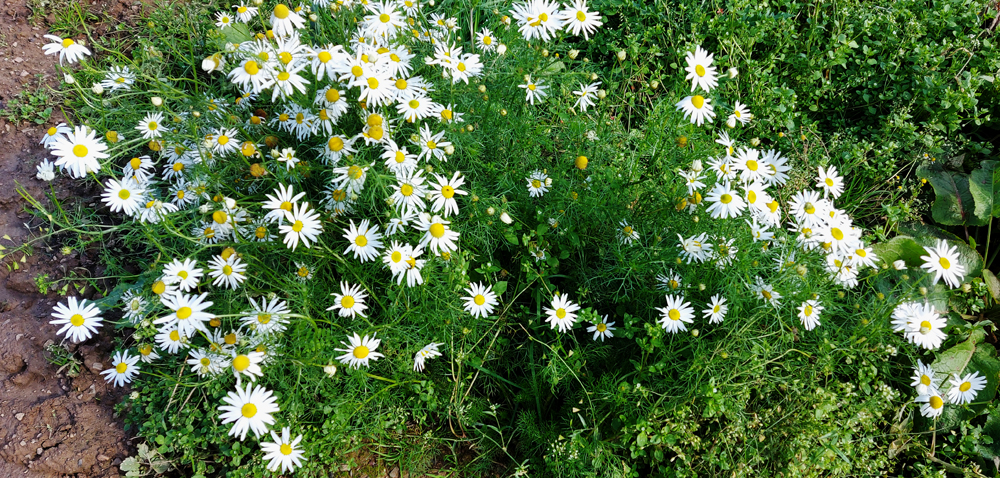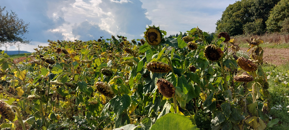 Das Gemüse im Foto mit den leuchtenden Farben haben wir am 13. September geerntet. Alle Zwiebeln waren prachtvoll. Jetzt steht nicht mehr soviel auf dem Acker, aber immer noch genug. Nehmt euch für den Sonntagsspaziergang eine Tasche mit! Die Kartoffeln wurden bereits gerodet, doch zwischen den Furchen lassen sich noch genügend Knollen aufsammeln. Und die Blumen sind zurzeit besonders schön. Cosmeen und andere kommen ursprünglich aus Gebieten mit kurzen Tagen. Sie sind „Kurztagspflanzen“, sie blühen erst richtig, wenn die Tage kürzer als 13 Stunden werden. Die weißen Blumen sind keine Margeriten, sondern die „Geruchlose Kamille“. Sie ist auf der Nordhalbkugel sehr verbreitet und blüht als eine der letzten Arten auf nährstoffreichen oder gestörten Böden bis November/Dezember. In Neubaugebieten mit verdichteten Böden sollte man sie in den Garten holen. Die abgeblühten Sonnenblumen bleiben stehen für die Vögel und die Insekten, die sich darauf wohlfühlen. Das Beitragsbild zeigt die Rückstände der Apfelkelterung, den Trester. Er wurde zur Bodendüngung auf dem Acker verteilt. Bodenlebewesen lieben ihn.